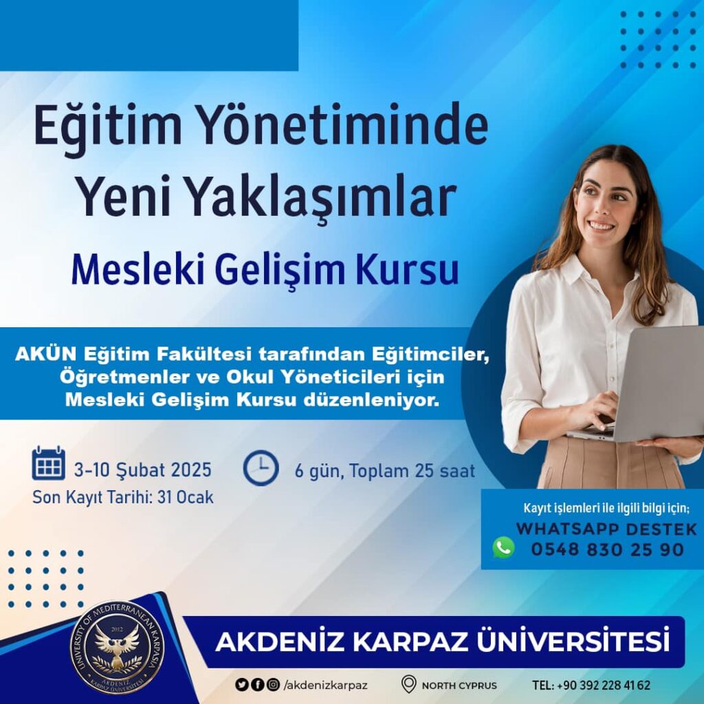 AKÜN Eğitim Fakültesi tarafından Eğitimciler, Öğretmenler ve Okul Yöneticileri için Eğitim Yönetiminde Yeni Yaklaşımlar Mesleki Gelişim Kursu düzenleniyor. Detaylı bilgi için 0548 830 25 90 numaralı telefondan bize ulaşabilirsiniz.